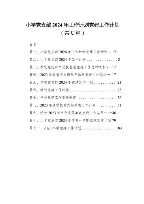 1、小学党支部2024年工作计划党建工作计划(共U篇)目录篇一、小学党支部2024年工作计划党建工作计划.2篇二、小学党支部2024年工作计划8篇三、学校党支部书记抓基层党建工作述职报告.12篇四、2023学校落实全面从严治党责任工作总结.17篇五、学校党支部2024年党建工作计划21篇六、学校党建工作制度25篇七、学校党建工作责任制度26篇八、2023年度学校党支部党建工作计划31篇九、学校2023年半年党风廉政建设工作总结40篇十、小学党总支2024年度第一学期党建工作计划79篇十一、2023小学党建工作计划83篇一、小学党支部2024年工作计划党建工作计划%指导思想2024年,X小学党支部将