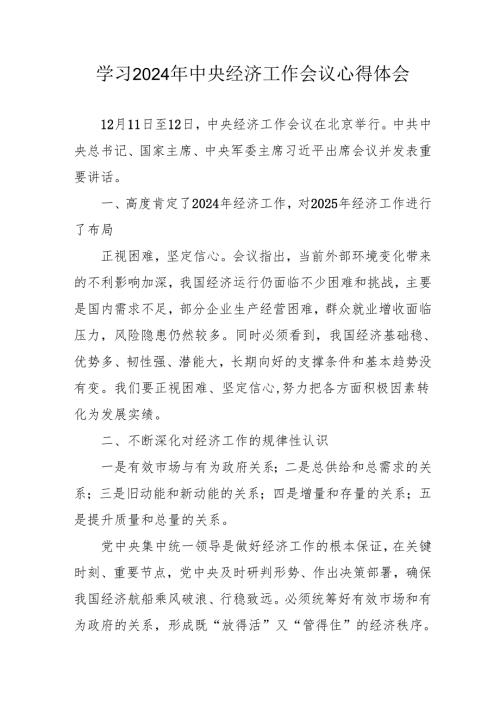 本文(学习2024年《中央经济工作会议》心得体会 汇编4份.docx)为本站会员(peixunshi0)主动上传,三一文库仅提供信息存储空间,仅对用户上传内容的表现方式做保护处理,对上载内容本身不做任何修改或编辑。 若此文所含内容侵犯了您的版权或隐私,请立即通知三一文库(点击联系客服),我们立即给予删除!
