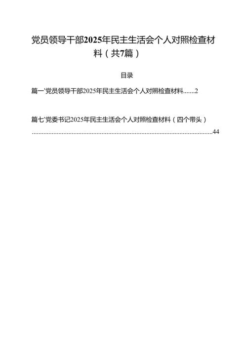 1、党员领导干部2025年民主生活会个人对照检查材料(共7篇)目录篇一党员领导干部2025年民主生活会个人对照检查材料.2篇二2025年度民主生活领导班子四个带头检查材料9篇三、副市长2025年民主生活会个人检查材料18篇四、某县纪委书记、监委主任2025年度民主生活会“四个带头”对照检查材料24篇五公司领导班子2025年度民主生活会对照检查材料(四个带头)31篇六、国企党委书记2025年民主生活个人检查发言材料(四个带头)38篇七党委书记2025年民主生活会个人对照检查材料(四个带头)44篇一、党员领导干部2025年民主生活会个人对照检查材料根据组织安排,我紧扣民主生活会主题,在认真学习、谈心谈